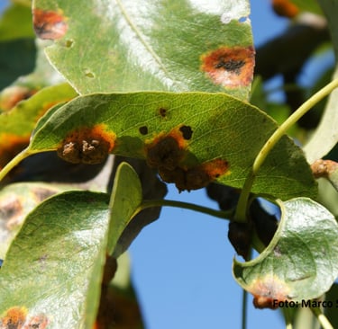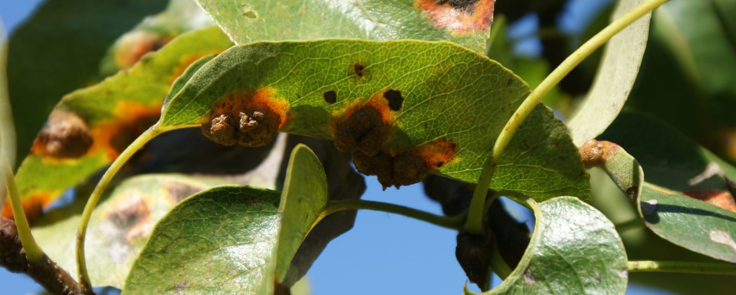 Der Pilz befällt Birnen im Frühjahr, wenn der Wind Sporen von infizierten Wacholdern verbreitet. Dabei kann der Pilz bis zu 500 Meter zurücklegen. Typische Symptome sind orangefarbene Flecken und Verdickungen auf den Blättern, die zu Blattverlust und Schwächung des Baumes führen.